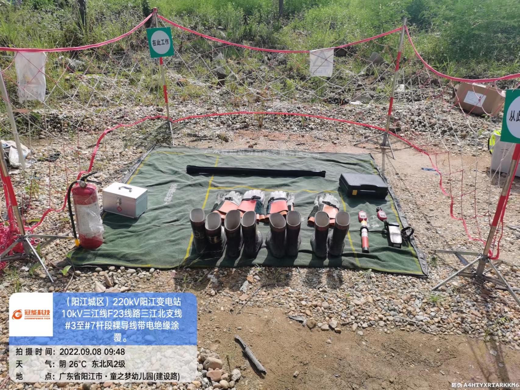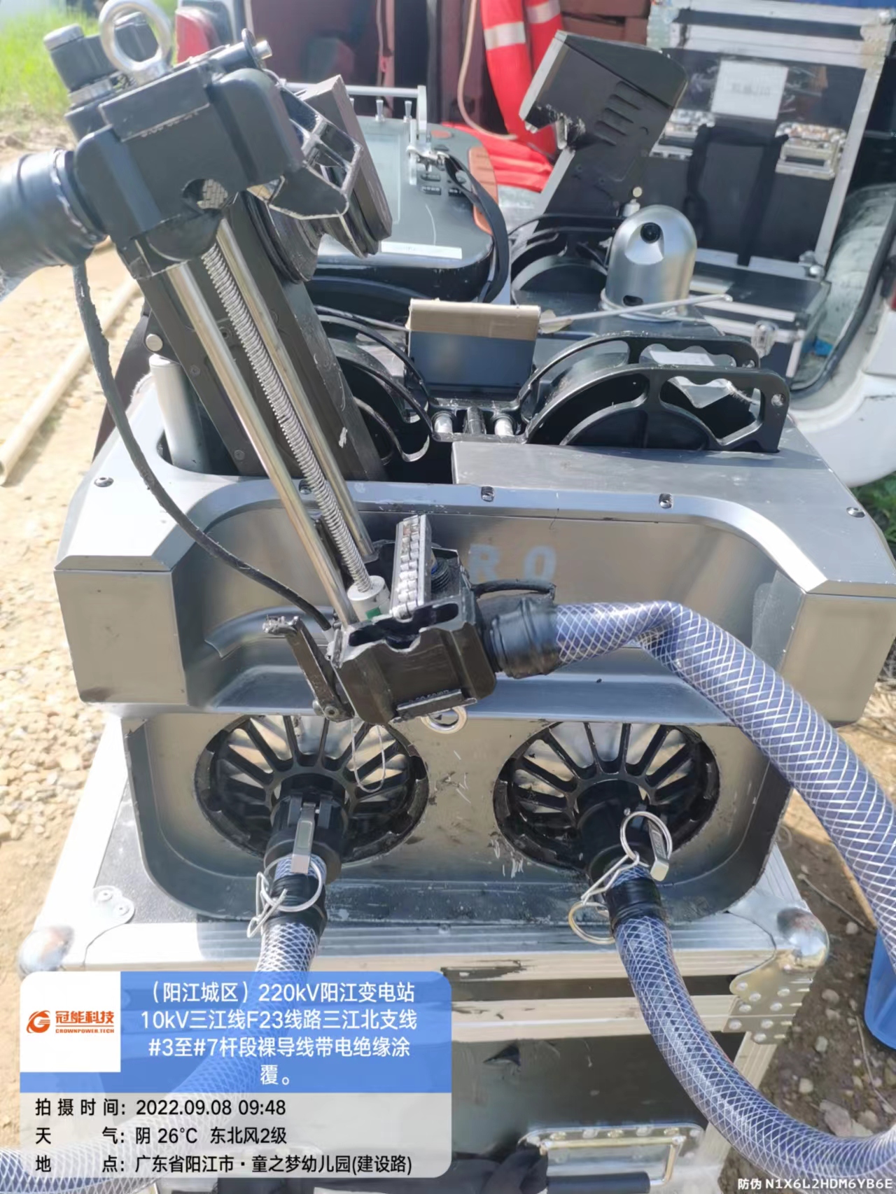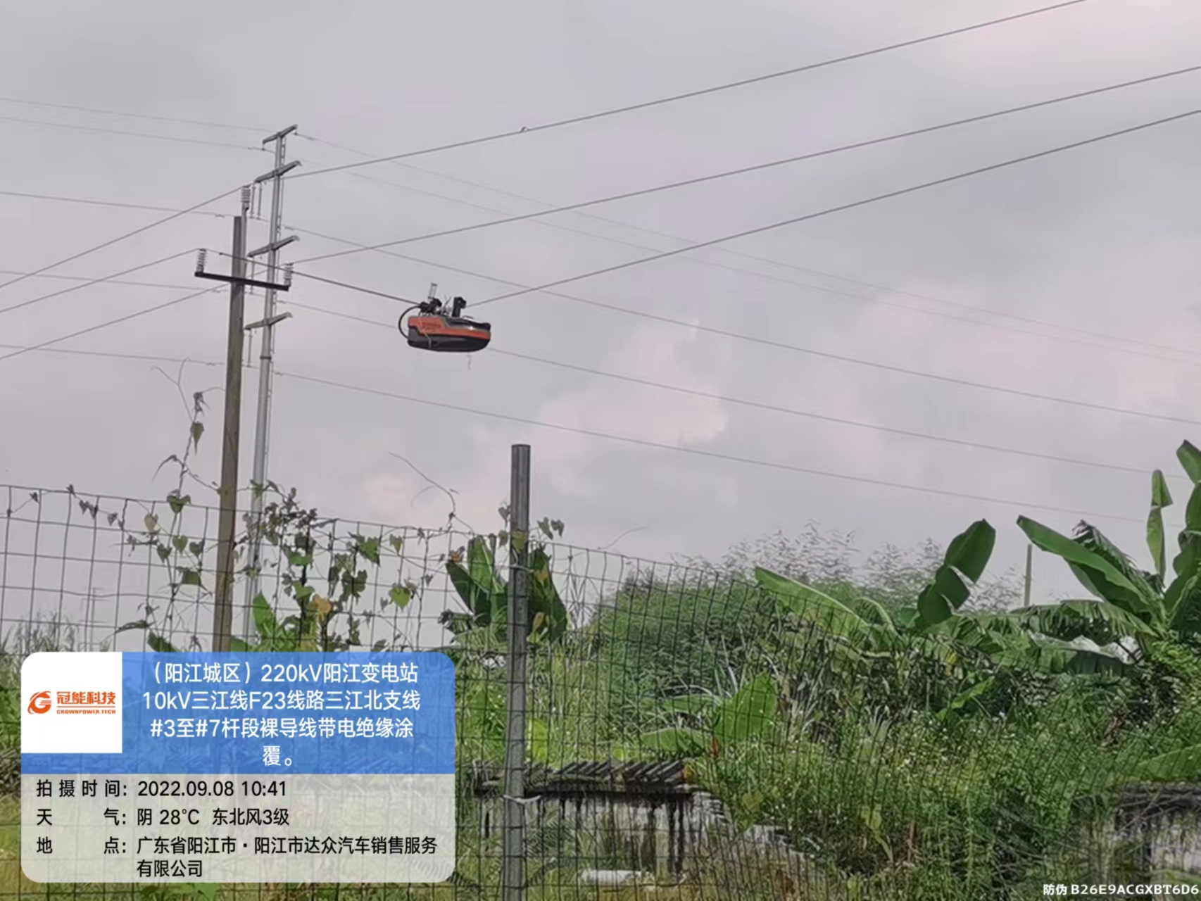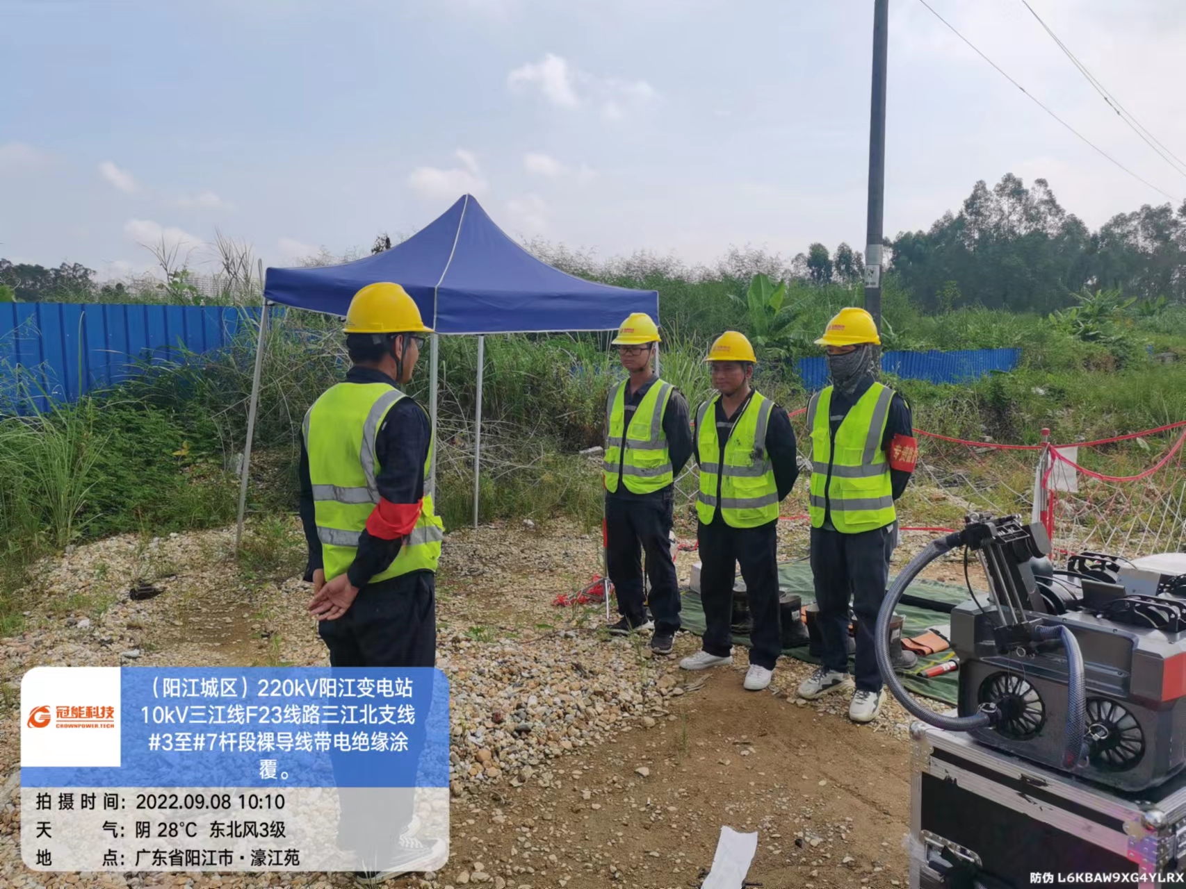 陽江城區220kV陽江變電站10kV三江線F23線路三江北支線#3至#7桿段裸導線帶電絕緣涂覆及交底。