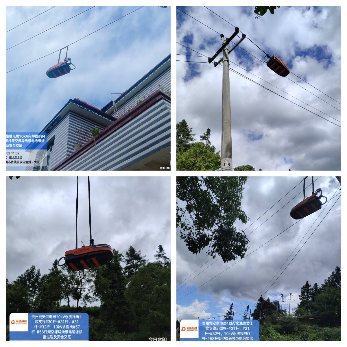 近日,廣東冠能來到貴州,分別對向坪線、永洗線黃土坎支線進行帶電絕緣涂覆,工作人員在不停電情況下,操作一臺帶電絕緣化涂覆機器人在一段40米裸導線上從左到右平穩滑動,用時20分鐘將40米長電線成功涂上絕緣材料。
