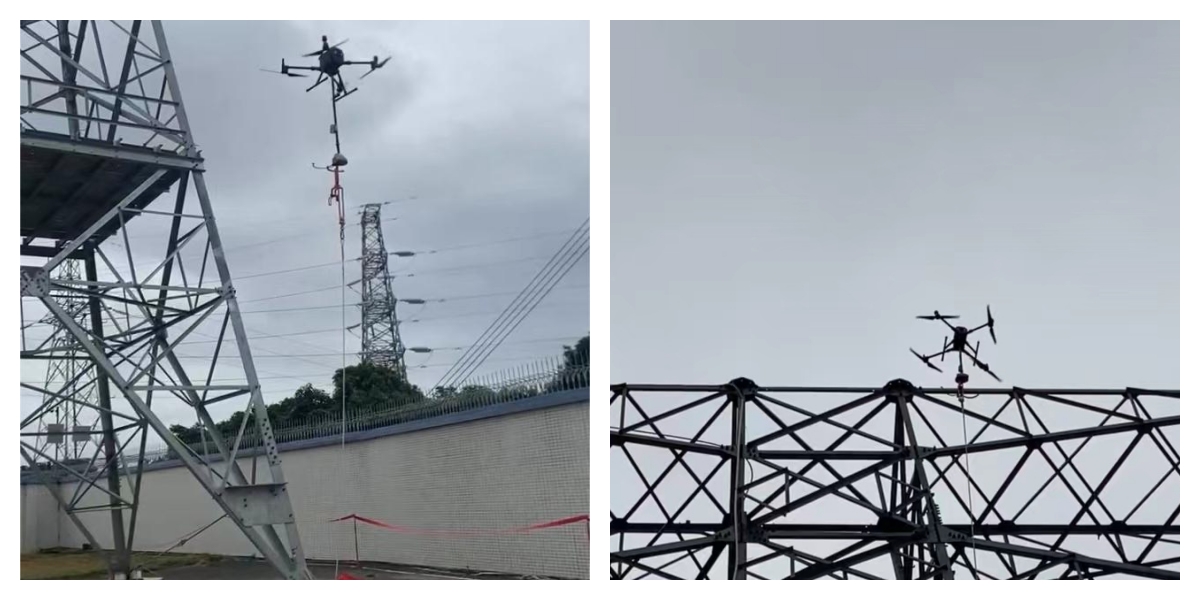 現場作業人員在給專家們講解新型登塔防墜裝置,該裝置無需登塔預安裝,無需停電加裝,不改變作業人員登塔習慣的情況下,通過無人機實現裝置的快速安裝與拆除,可有效保障首位登塔人員的安全,登塔全過程保護,廣泛用于輸電線路登塔作業人員高空墜落防護。