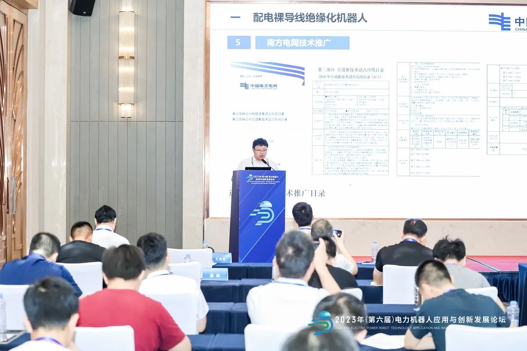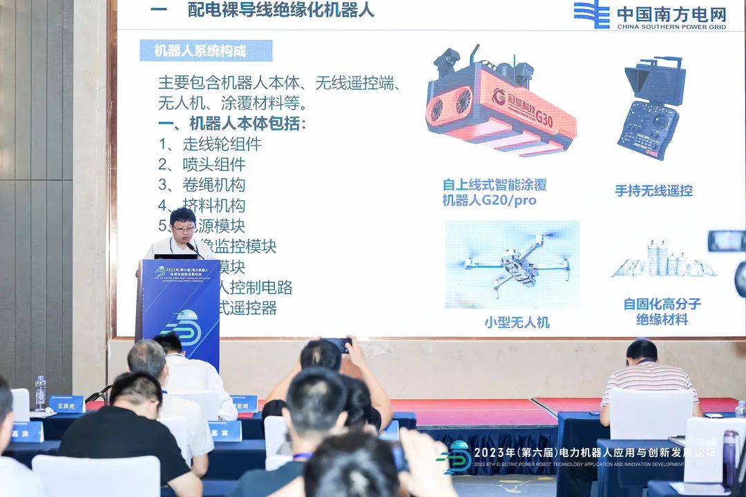 ? ? ? ?在專題論壇中配電領(lǐng)域機(jī)器人技術(shù)專題論壇上,由南方電網(wǎng)科學(xué)研究院有限責(zé)任公司代表劉旭做配電裸導(dǎo)線絕緣化機(jī)器